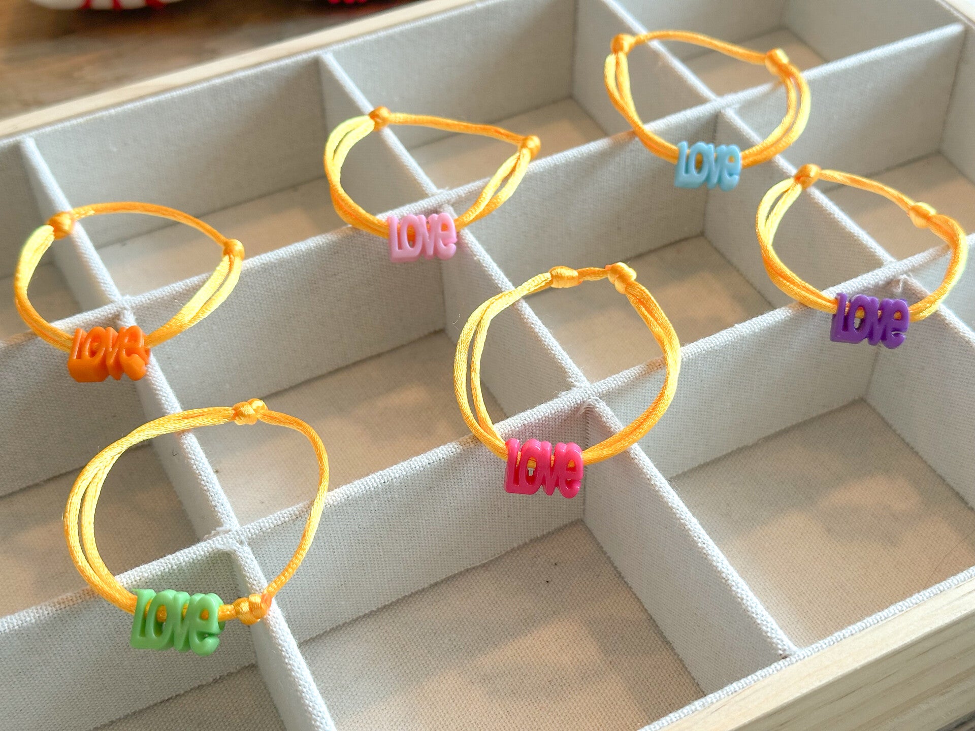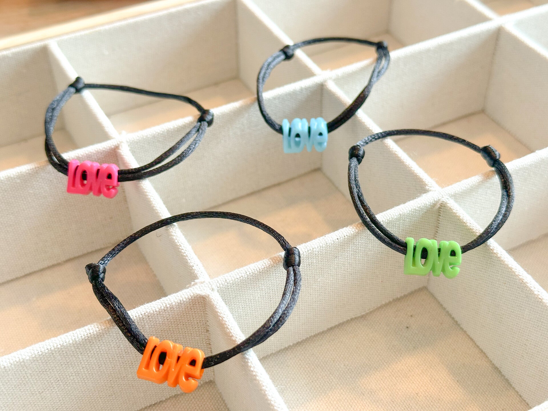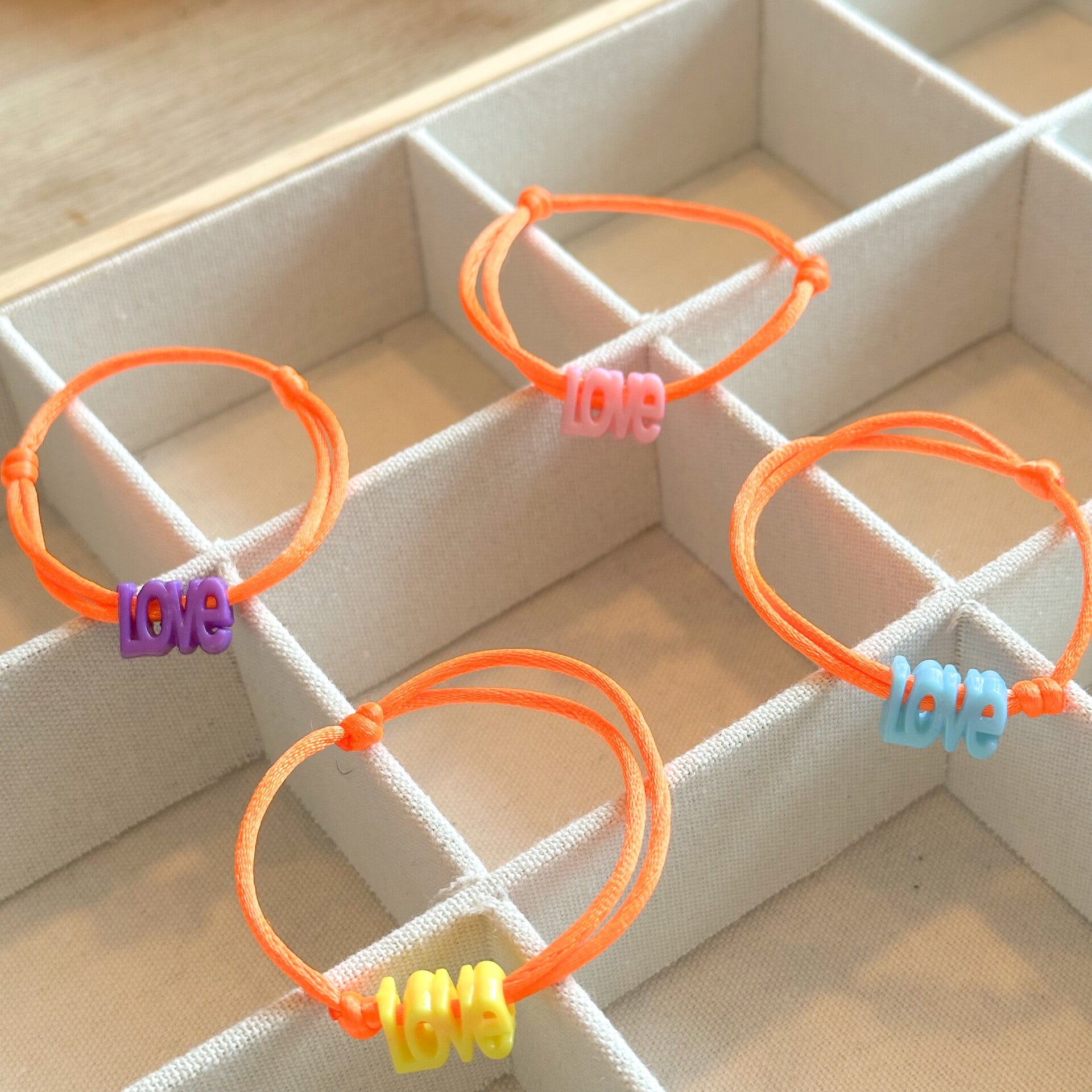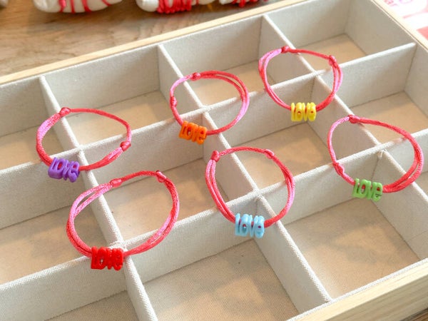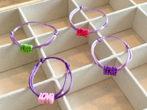 Een elegant satijnkoord armbandje met verstelbare schuifknopen.Voorzien van een leuke vrolijke LOVE kraal naar keuze.