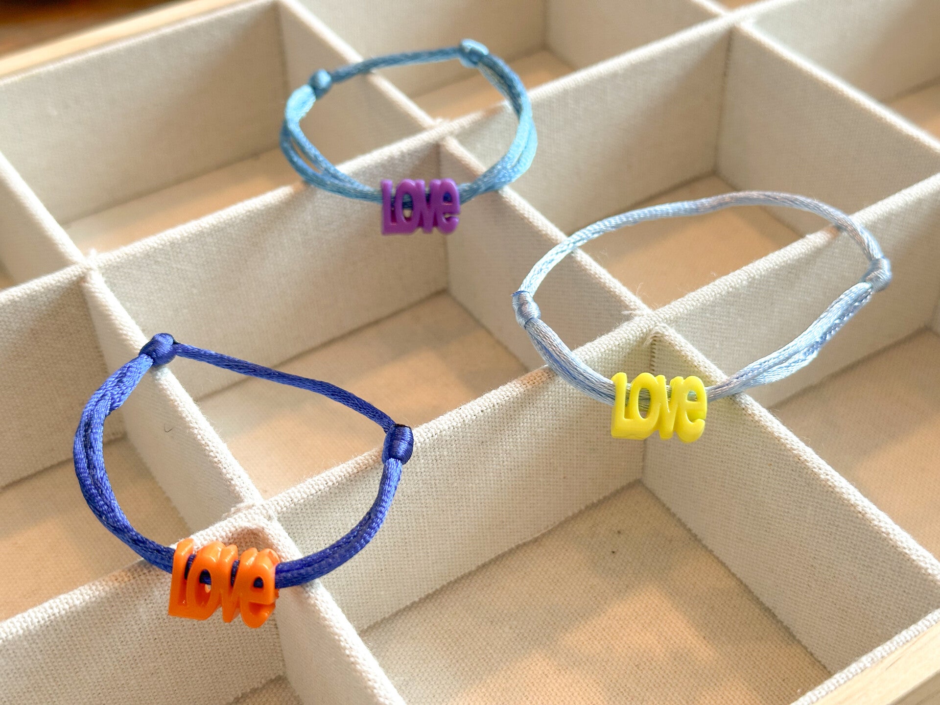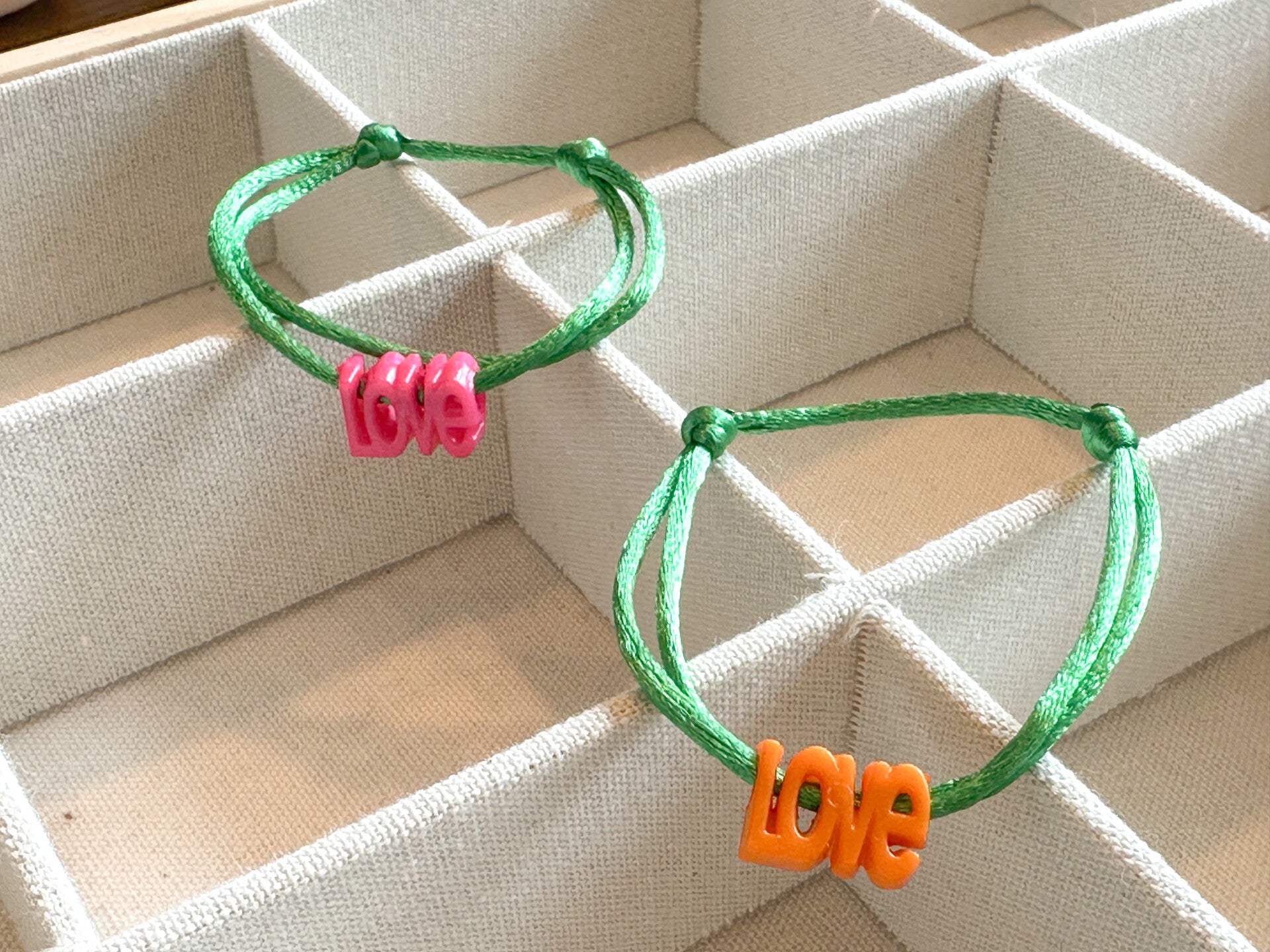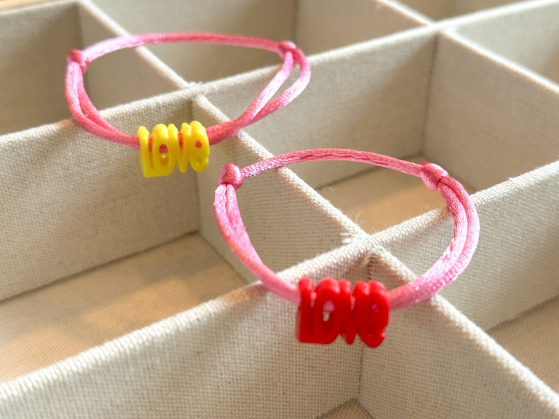 Een elegant satijnkoord armbandje met verstelbare schuifknopen.Voorzien van een leuke vrolijke LOVE kraal naar keuze.